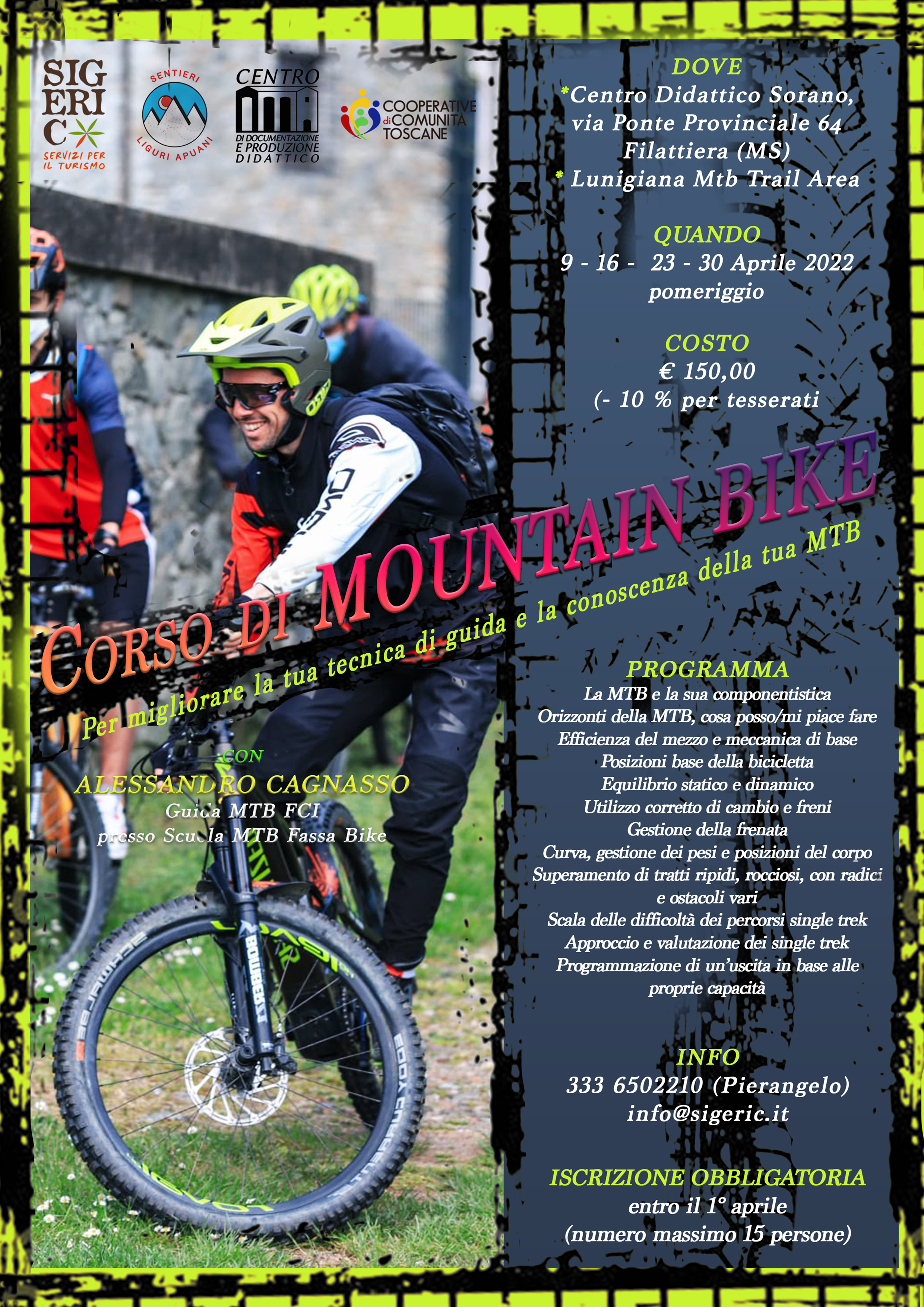 Il corso è organizzato da Sigeric Soc Coop e dall'Associazione di Promozione Sociale Sentieri Liguri Apuani. Il corso sarà tenuto da Alessandro Cagnasso, guida MTB della Federazione Ciclistica Italiana, esperto biker e guida da molti anni della Scuola della Federazione Ciclistica Italiana FASSA BIKE MTB SCHOOL, in Val di Fassa – Trentino.